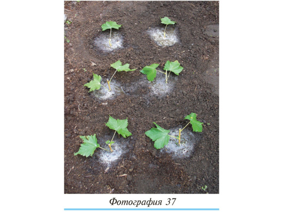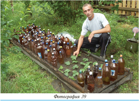 На фото 37 показана посадка черенков в рыхлую почву, но не вертикально, а под небольшим уклоном. Затем обильный полив специальным раствором: дождевая вода, аммиачная селитра (можно и без селитры), древесная зола и перегной. Затем укрытие бутылками.