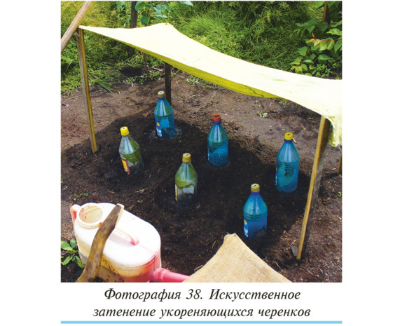 Варианты попроще: 1. Затенением может служить крона раскидистого дерева. 2. Можете попробовать использовать вместо светлых бутылок тёмно-коричневые, тогда полную тень можно не делать, лучше полутень (фото 39). Результат (приживаемость и размер однолетнего будущего куста) чуть хуже, но тоже достаточно эффективен.