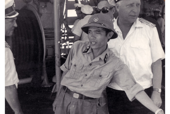 Когда УК «Бородино» отчаливал от пирса Камрани, курсанты собрались на астрономической палубе и наблюдали за швартовкой и отходом, было весело, все обменивались впечатлениями, разговаривали, понимая, что через неделю будут дома. Алексей смотрел на большую группу провожающих вьетнамских военных и вдруг заметил, что один из офицеров оцепления у самого края пирса вдруг стал по-военному отдавать честь отходящему кораблю. Его фигура показалась очень знакомой Алексею. Да это же был лейтенант Фу! Он узнал его и, перейдя на спардек, начал махать офицеру рукой прощай! Через минуту фигура ответила прощальным взмахом: пока, линсо!