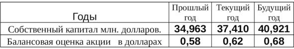 В нашем случае, для текущего года балансовая оценка акции равна: 37,410/60=0,62 доллара. Если фирма обанкротится, то владелец одной акции получит компенсацию равную балансовой оценке акции. Своего рода страховое возмещение на самый крайний случай.