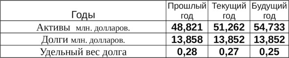 Как видно из таблицы, имеет место тенденция снижения удельного веса долга. Это означает и снижение рисков бизнеса. Проблема в том, что риски и прибыльность бизнеса идут рука об руку. Большой прибыли без большого риска не бывает. Низкий риск связан с низкой прибылью. Таким образом, коэффициент удельного веса долга не должен быть слишком большим. В этом случае лавина рисков похоронит фирму. Слишком малый коэффициент означает недополученную прибыль и отсутствие развития.