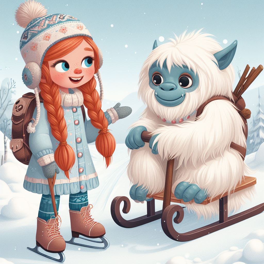 Однажды, когда Маруся шла домой после катания на коньках, она увидела на дороге загадочную фигуру, напоминавшую маленькую обезьянку. Это был снежный человечек, весь обросший мягкой шёрсткой. Маруся вспомнила, что про таких загадочных существ она видела недавно передачу по телевизору. Маленький снежный человечек сидел на санках и держал в руках палку. Маруся подошла к нему и спросила: