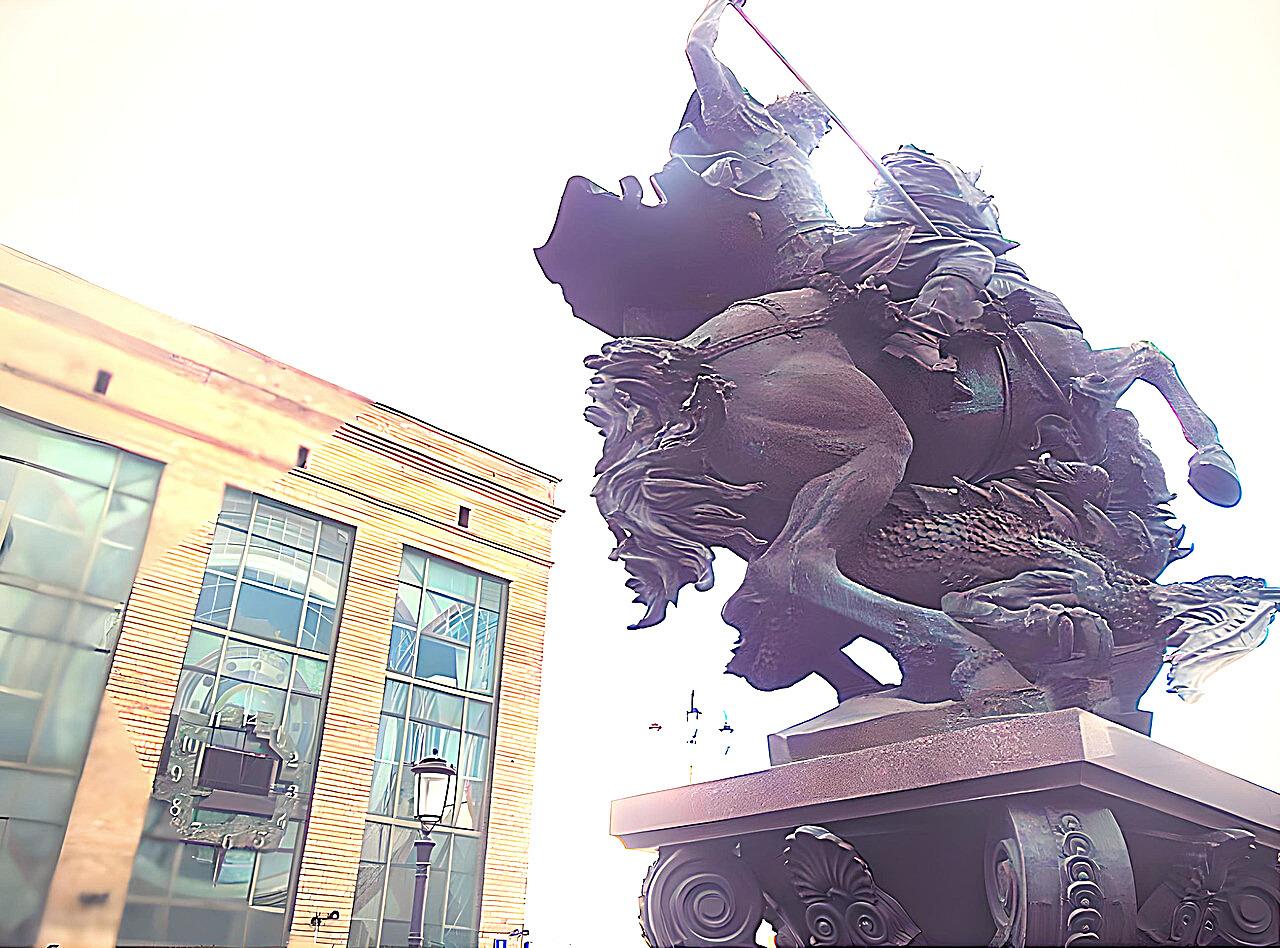 Я выхожу из здания Ленинградского вокзала и застываю в изумлении передо мной громоздкая скульптурная композиция Воина, копьем пронзающего Крылатого Змея на фоне все тех же зияющих пустотой изувеченных часов «без стрелок».
