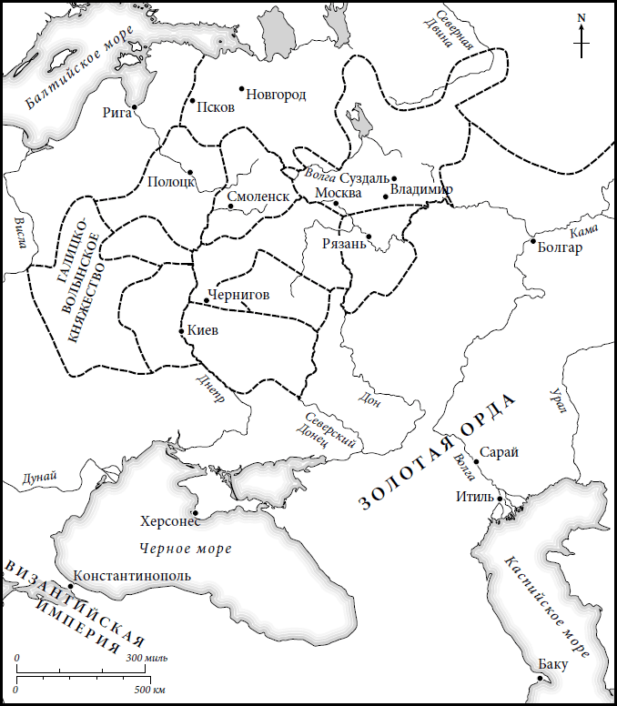 В 1223 году войска Киевской Руси при поддержке кочевников-половцев (тюркского племени, родственного печенегам и поселившегося в Северном Причерноморье и на Волге на их месте) вступили в бой с монгольской армией на реке Калке на территории современной Донецкой области на востоке Украины[99]. Монголы разбили союзные войска и казнили многих русских князей. Однако монголы решили не идти дальше и вернулись в Среднюю Азию. В 1232 году они вернулись, напали на город Болгар, «поплениша и покориша многу Нижнюю землю Болгорскую и грады разориша»[100]. Через четыре года они вторглись вновь на сей раз с войском, размер которого оценивается по-разному: от 25 до 140 тысяч человек. Под предводительством Батыя, внука Чингисхана, они завоевали Волжскую Булгарию и остались там. Болгар был взят в 1236 году, а Биляр и Сувар были разграблены. После этого войско Батыя обратило взгляд на города древнерусских княжеств: Рязань разграбили в 1237 году, Владимир (столицу Владимиро-Суздальского княжества) сожгли дотла в 1238-м; Киев взяли штурмом и уничтожили в 1240-м. Разграбили и все города Верхнего Поволжья: Городец, Кострому, Нижний Новгород, Ярославль, Углич и Тверь. Москва, в то время небольшой городок во Владимиро-Суздальском княжестве, была разграблена в 1238 году.