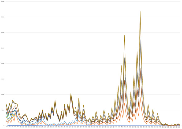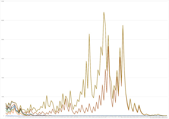 Thus, in the future, graphs are presented for the intervals from 60 to 70, where, surprisingly, a sharp increase in correlation can be observed again, when part of the functions goes down as a separate line, and one single one acts as the only upper correlating one (Graph. 8). In the future, the graph begins to change again for the interval from 70 to 80 and the state described in the early interval for the interval from 40 to 50, it will be possible to observe an increase in the number of peaks at the beginning to two classes, and in the center of three large maximum peaks, where you can observe a situation where the main plan describes the main yellow function, correlation with which it increases for the red function at the third peak and with a small second central right peak, from where it is possible to trace the similarity of the pictures, but with a noticeable shift in Graph 9.