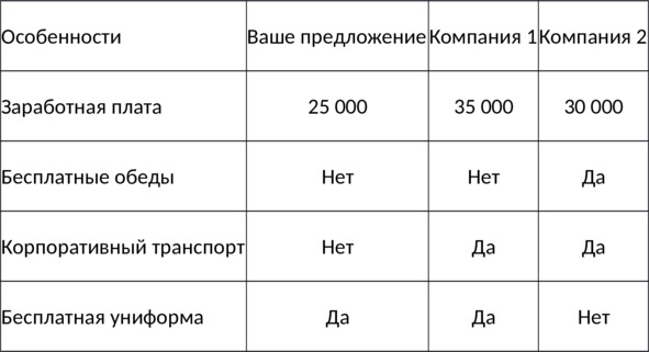 Чтобы наглядно визуализировать результаты анализа, рекомендуем составить таблицу для сравнения. При оценке EVP конкурентов может показаться, что предложения похожи это повод подумать, что вы можете предложить нового для имеющихся и будущих сотрудников.