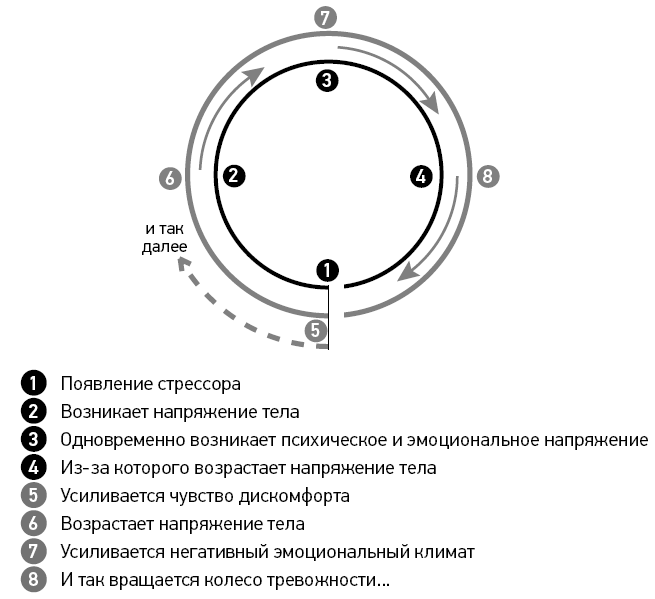 Когда я нахожусь в трудной ситуации, вызванной внешними обстоятельствами или «маленьким велосипедом», педали которого крутятся в моей голове, заставляя сосредоточиться на негативных, тревожных мыслях, у меня развивается психическое и органическое напряжение; это сказывается на химических процессах в организме. В результате постоянного взаимодействия психики сомы, сомы психики мышечные спазмы усиливают чувство дискомфорта, а следовательно, эмоциональный климат ухудшается. И крутится, крутится колесо беспокойства, навязчивых идей, внутреннего напряжения, судорог