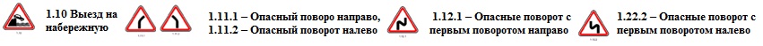 1.12.1, 1.12.2 «Опасные повороты». Участок дороги с опасными поворотами: 1.12.1 с первым поворотом направо, 1.22.2 с первым поворотом налево.