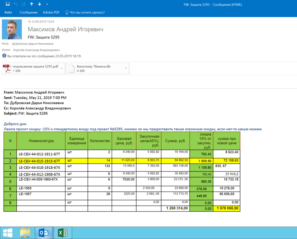 Процесс согласования специальных цен для Дилера под проект полностью автоматизировали и привязали к CRM-системе[8]. В настоящее время для получения дополнительной скидки достаточно внести спецификацию со стандартными ценами для Клиента, указать процент требуемой скидки. После нажатия нескольких кнопок менеджер получает ответ от руководителя коммерческой службы с возможными ценами под проект (рис. 2).