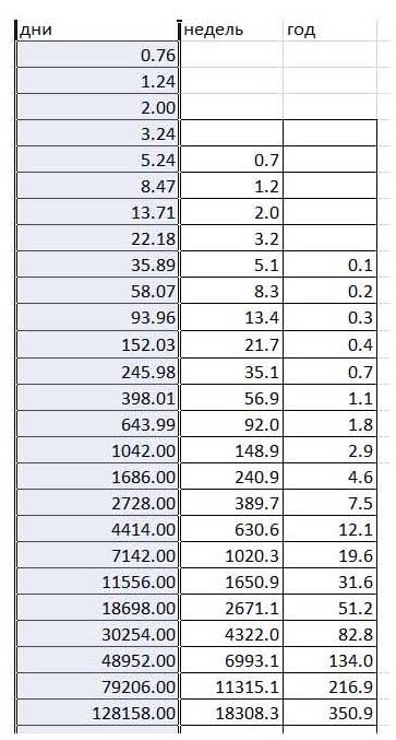 Что мы уже имеем? А мы имеем числа 18, 29, 48. И что же мы видим, а мы видим, что эти числа 18, 29, 48, очень близки к числам Люка 18, 29, 47. Чтобы получить точно 48 часов, надо добавить всего лишь несколько минут к 18 часам. Если считать по дням то получается примерно 0.77, 1.23, 2.0 дня. Это последовательность, тоже похоже на числа Люка, только умноженное на два, то есть сдвоенная Люка.