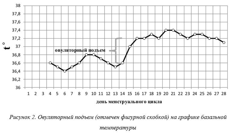 о произошедшей овуляции говорит наличие подъема графика, как минимум, на 0,4-0,5̊; если овуляции не было, график БТ будет монотонным (рисунок 2);