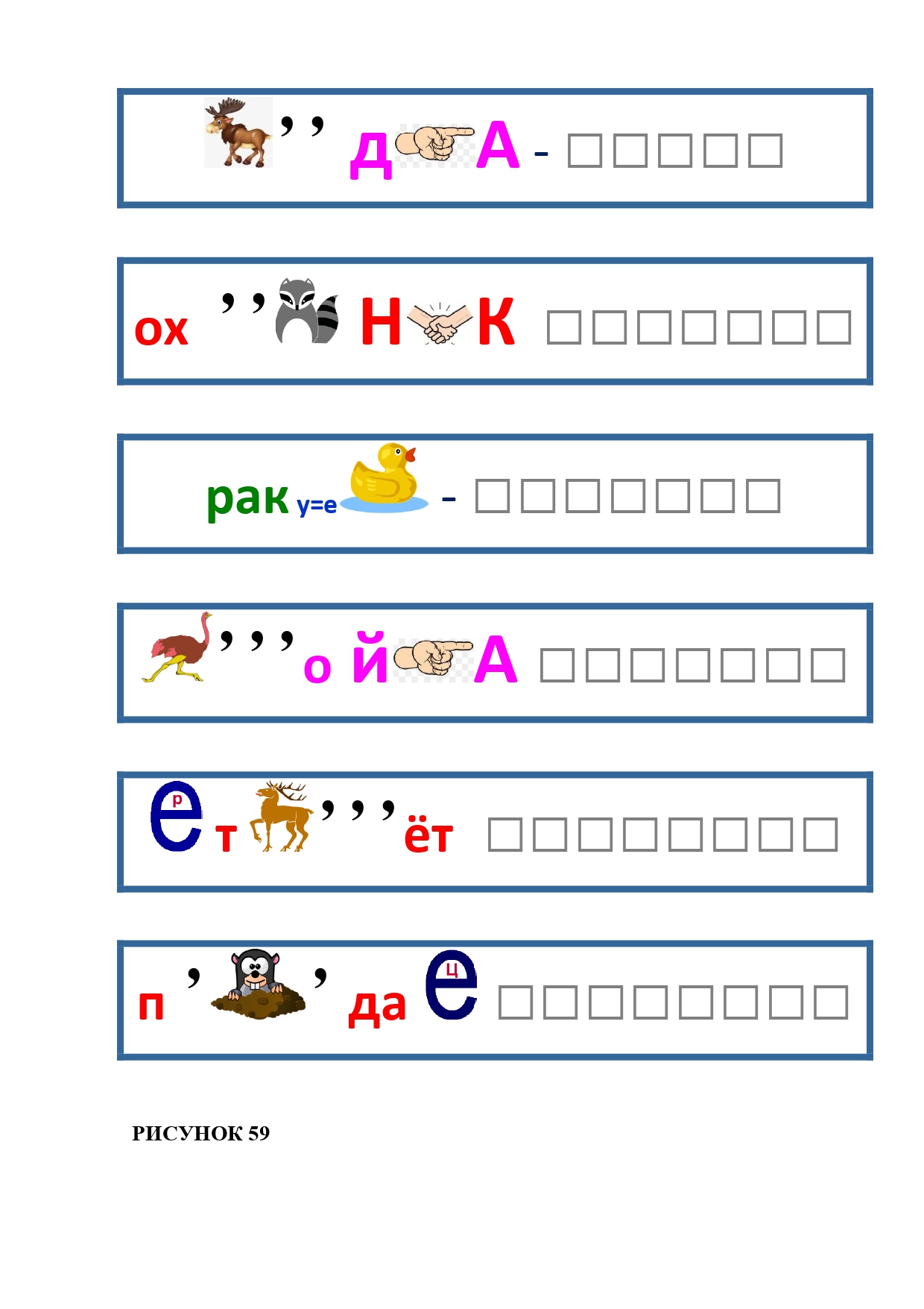 РИСУНОК 59: лодка, охотник, ракетка, стройка, вертолёт, продавец