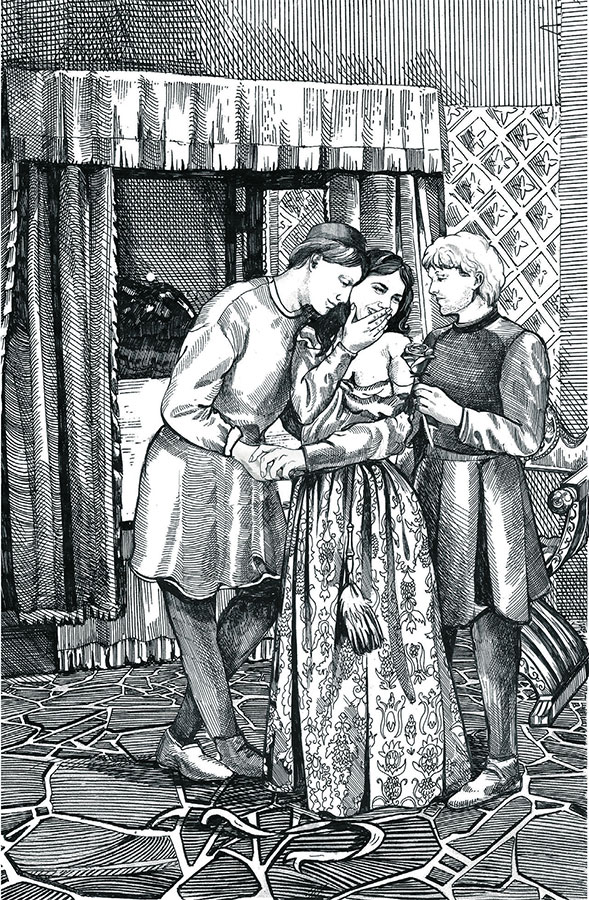 Юноши как бы прощались с каждым пальчиком, с каждой ложбинкой на теле своей подруги. И Розалина благодарно отдавалась, ероша волосы на головах прильнувших к её груди любовников. Переплетение плоти будто продолжало узоры природы на только что законченной ониксовой столешнице. Медленные и плавные движения тел в паване истомы всё более являли страсть, которая, в свою очередь, накаляясь и ускоряясь, переходила в грубое и беспощадное овладевание ненасытной распалённой красавицей.