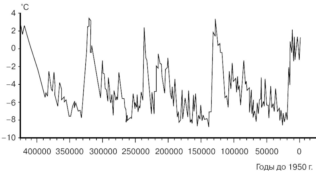 Длительные периодические провалы на графике ледниковые периоды. Короткие тепловые вспышки межледниковые периоды. На графике мы отчетливо видим четыре ледниковых периода и пять межледниковий. Мы живем в самом конце пятого. Обратите также внимание, как резко падает температура при сваливании климата в ледниковый режим. Каких-нибудь 5001000 лет и планету уже не узнать Нулем на вертикальной оси обозначена нынешняя климатическая норма. (Если быть точным и придирчивым, то уже не нынешняя, а климатическая норма середины ХХ века.) То есть график показывает не абсолютную температуру, а отклонения среднеглобальной температуры от современного уровня за 400 000 лет.