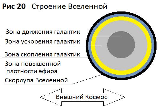 А). За границей Вселенной, в реально пустом пространстве Внешнего Космоса, где нет эфира и энергии ни в каком виде, плотность и температура отсутствует (минус-бесконечность). Следовательно, и внешнего давления на Вселенную, отсутствует. Для сравнения; как твёрдый лёд на пруду зимой, образуется под воздействием морозного воздуха, так и Внешний Космос замораживает внешнюю оболочку Вселенной, образуя из эфира абсолютную по прочности корку (Рис 20), назовём её Бэталл (бесконечно твёрдый эфир). К месту: «Плотность отношение массы вещества к его объёму». Таким образом, наша Вселенная, имеет вид яйца в скорлупе. Пофантазируем: Представим себе, что мы находимся за пределом Вселенной! Что мы увидим? Абсолютно ничего! Полная чернота пространства (полное отсутствие всякой энергии), и полная чернота внешней оболочки Вселенной (замёрзший эфир, ничего не излучает). В Библии, не зря сказано; «тьма внешняя». Так-как Скорлупа Вселенной состоит из единой массы эфира, то скорлупа не имеет какой либо структуры элементарных частиц, и их движения (тепло), следовательно, температура Скорлупы; абсолютный ноль, (не путать с минус бесконечность). Скорлупа Вселенной в свою очередь, своим «ледяным дыханием», образует, внутренний слой эфира, со сверхнизкой температурой, и соответственно, высокой плотностью. Этот слой так и назовём Зона Повышенной Плотности Эфира (ЗППЭ). ЗППЭ, своей плотностью и низкой температурой, останавливает расширение Вселенной. Точнее; высокая плотность эфира, останавливает сравнительно низкую плотность эфира, заключённую внутри вещества. Так как, причина остановки расширения Вселенной находится в свойствах эфира, то сила инерции галактик, Чёрных Дыр, Квазаров и так далее, отсутствует. Следовательно: На Скорлупу Вселенной, никакая сила движений вещества изнутри, не давит. Звёзды, галактики, квазары, всё вещество, скапливаясь и сталкиваясь на границе слоя ЗППЭ, образуют Зону Скопления Галактик (ЗСГ). В результате слияния вещества, в Зоне Скопления галактик происходит грандиозные ядерные реакции с чудовищной энергетикой.