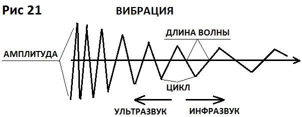 Г). Вибрация. Определимся с механизмом воздействия вибрационных волн эфира на вещество. Вибрационные волны эфира, как звуковые волны, имеют амплитуду, длину волны и частоту (цикл) за единицу времени (секунда), только значительно превышая значение звука, (Рисунок 21). Тоесть: 1 герц (колебанье) = 1 секунде, в эфире 1секунда, может быть = 1000 циклов (колебаний) и выше. ВЭ, чем плотнее эфир, тем короче длина волны, и выше амплитуда и сильнее мощность волны, и соответственно, при уменьшении плотности, длиннее волна, и ниже амплитуда. Вещество состоит из атомных решёток, соответственно из атомов с ядром (99% массы) и атомным облаком (1% массы). Это значит, на ядро атома, может воздействовать волны вибрации эфира с высокой частотой ВЭ. ВЭ, увеличивают частоту колебания ядер атомов, то есть, прибавляют температуру веществу. ВИМЭ с низкой частотой воздействуют на облако атомов, воздействуя на атом в целом давлением. Это значит, чем выше частота волны, тем большее воздействие волны на малые тела в качестве температуры. Чем ниже частота волны, тем больше воздействие волны на тела, в качестве давления.