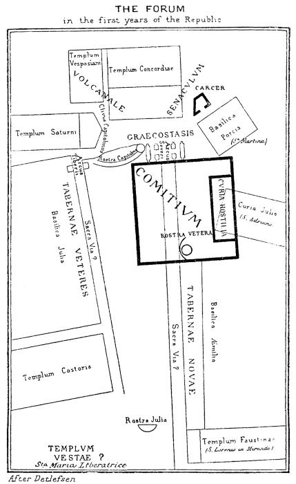 Жаль, что римская администрация не сочла нужным печатать дневник этих интересных раскопок; этот пробел пополнен сочинением члена французского археологического института в Риме, Фердинанда Дютера[9], о Форуме, которым я буду много пользоваться[10]. Дютер был свидетелем работ Розы; он следил за ними день за днем, ходил за рабочими, записывал и зарисовывал малейшие остатки орнаментов, самые маленькие куски скульптуры, встречавшиеся ему по пути. Его сочинение не только знакомит нас с Форумом после раскопок Розы, но он попробовал познакомить нас с его древним видом. Он реконструировал его разрушившиеся храмы, поднял его опрокинутые колонны, поставил статуи на их прежние основания и воссоздает перед нами все эти великолепия, от которых сохранилось всего несколько обломков. Я знаю, что в подобного рода работы входит всегда много предположений, но реконструкция Дютера, опирающаяся обыкновенно на точные указания, в общем очень правдоподобна. У него заметны, правда, некоторые пробелы и ошибки, объясняющиеся тем, что Дютер не археолог по профессии и что в то время, когда он писал свою книгу, раскопки еще не были окончены.