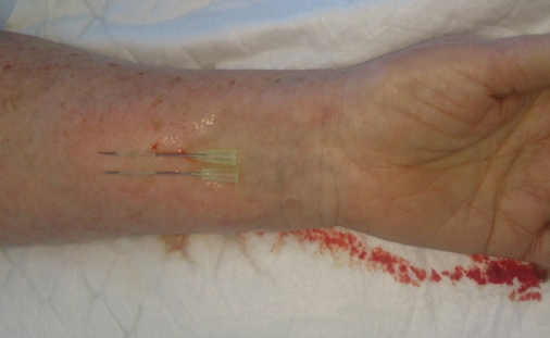 Далее делаем новокаиновую «подушку» в месте взятия лоскута и внутрикожно проводим параллельно 2 инъекционные иглы так, чтобы они просвечивались. Выходим с противоположной стороны «подушки». Должно получиться, как на рисунке.