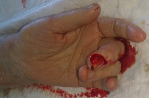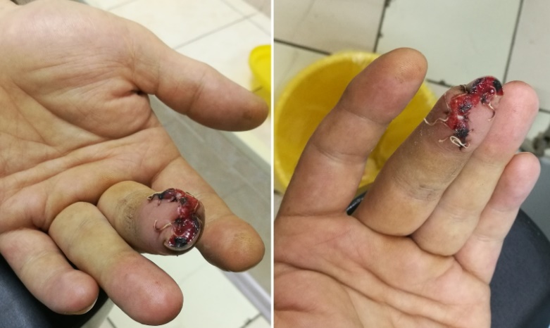 Из анамнеза: по личной неосторожности получил травму II-IV пальцев правой кисти «турбинкой». II и IV пальцы получили только поверхностные раны, а вот III п. открытый перелом ногтевой и средней фаланг, повреждение сухожилия глубокого сгибателя с дефектом до 1 см. В дежурном стационаре была выполнена ПХО ран, гипсовая повязка. Пациент от госпитализации отказался. Дальнейшее лечение получал в платной клинике, а из нее попал ко мне.