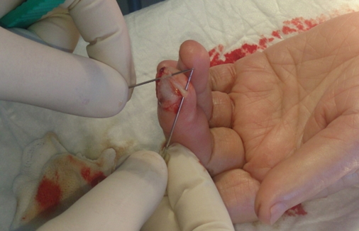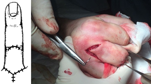 Мой «любимый» разрез. Двумя лоскутами раскрываем весь палец. Развернул их, закрепил на «растяжках» и работай, сколько «душе угодно».