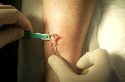 Затем скальпелем, начиная от кончиков игл, скользим по получившимся рельсам к пластиковой части, как показано на фото.