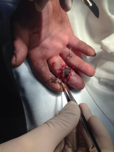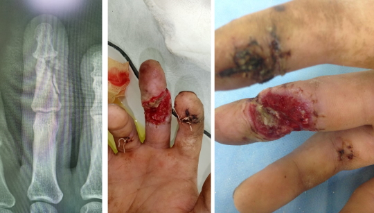 При осмотре влажный некроз по ладонной поверхности средней фаланги III пальца со скудным гнойным отделяемым. Соседние раны заживают первичным натяжением.