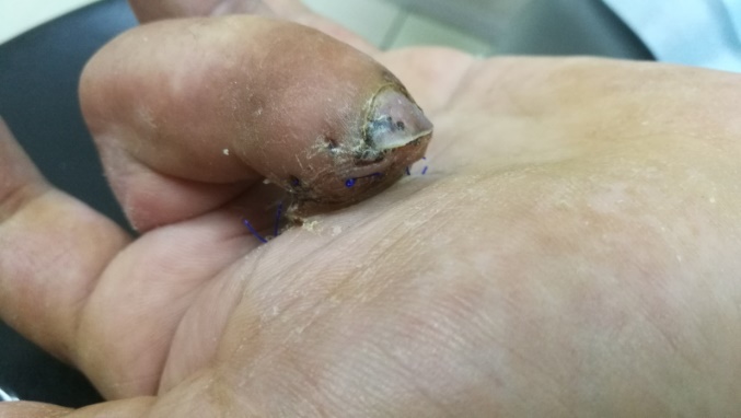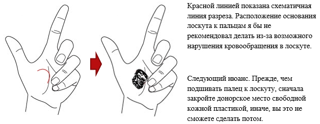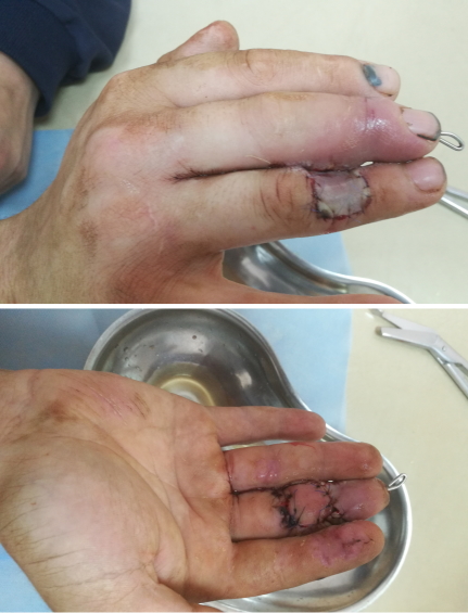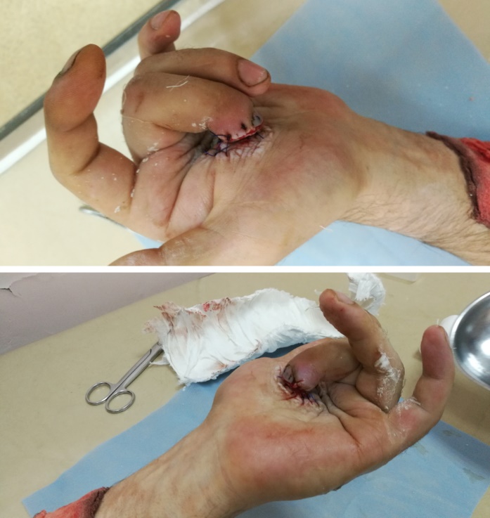 Пришлось распустить швы, убрать поврежденные ткани, выкроить лоскут на тенаре и подшить палец. Все просто, но