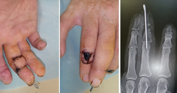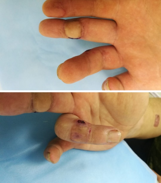 На момент описания этого случая, раны зажили, движения в суставах кисти в полном объеме, отсутствует только активное сгибание ногтевой фаланги III пальца, пассивные- в полном объеме.