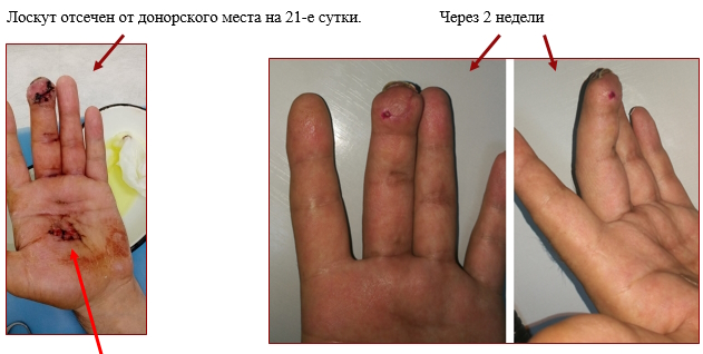 Обратите внимание, свободная кожная пластика не прижилась на донорском месте. Об этом мы говорили в теоретической части. Она была выполнена для закрытия раневого дефекта на период перерождения фиброзной ткани ладони.