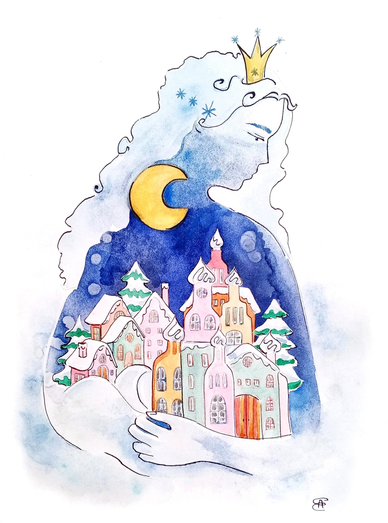 Всё замерло, кроме самих людей. Снег на земле лежал, не таял, и небо не украшали ни солнце, ни одна звезда. Все жили в зимнем полумраке, как во сне. Коль время насовсем исчезло, то многие надежду потеряв, не зная, чем занять себя, со скуки стали засыпать, и в спячку уходили будто сами медведи. Зима, верней её богиня, недолго думая, взяла бразды правления над Царством в свои руки. В санях, волшебных сверкающих морозом, она каталась по своим новым владеньям. И хоть в отсутствии секунд ей вызвать снегопад было никак, но вихри из сугробов снега, что никогда не таял, она поднимала без всякого труда, замораживая всех тех оставшихся зевак, кто был ей не доволен.