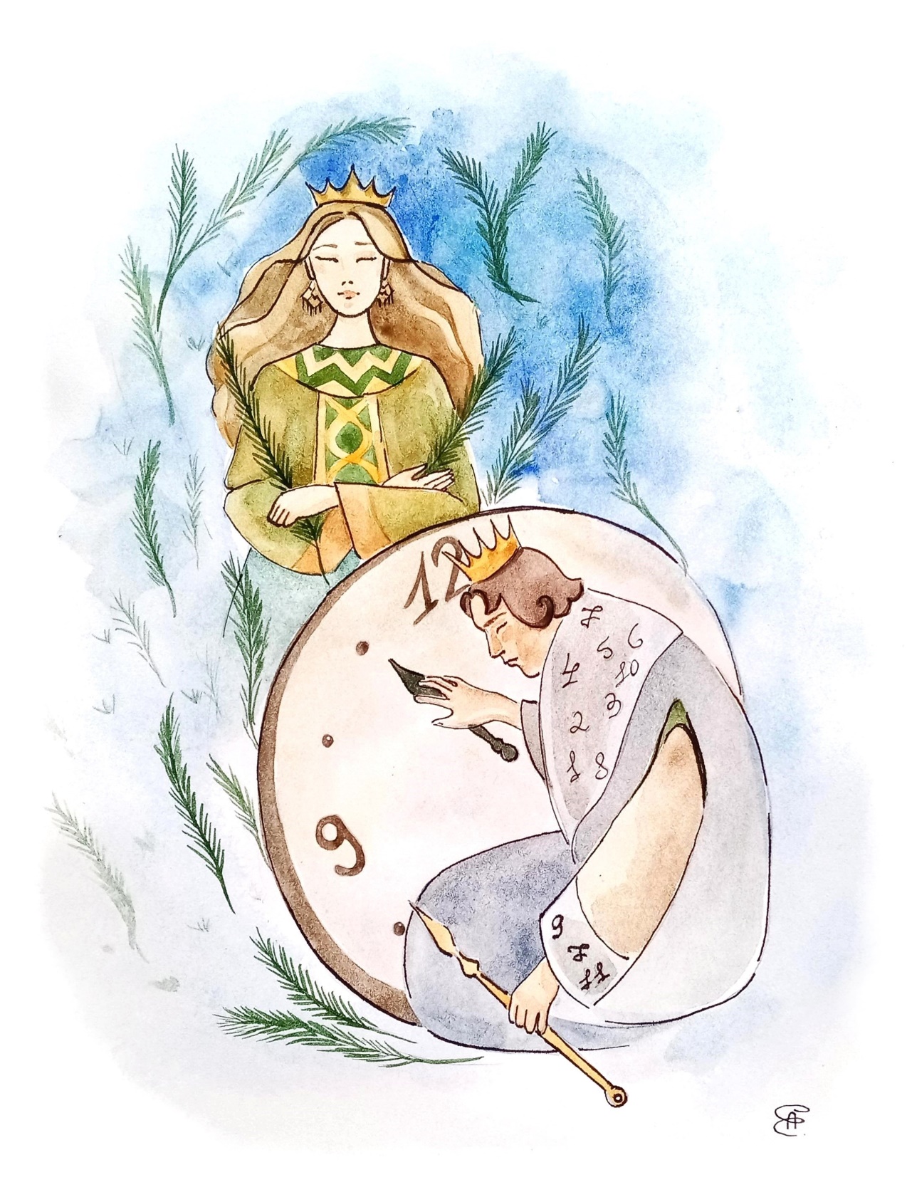 Всё шло своим чередом, но однажды случилась беда, которую даже сам повелитель времени не мог исправить. Его любимая жена, что была прекрасной словно роза, стала понемногу чахнуть, пока совсем не разболелась и не слегла. Разные лекари и знахари пытались ей помочь, но их усилия были впустую. Тогда на помощь пришли колдуны, они обложили Царицу ветвями вечнозеленой ели, покрыли ими всю царскую кровать. На щеках больной появился было здоровый румянец, но как только все иголки с ветвей опали, все волшебство мигом пропало. Царь, не теряя надежду, велел менять их каждый день, но все было впустую. Тогда от горя и бессилия он сел возле своей больной жены и сделал то, что изменило мир. Секунды начали тянуться годами, пока стрелки часов и вовсе не остановились. В канун нового года Царь остановил ВРЕМЯ.