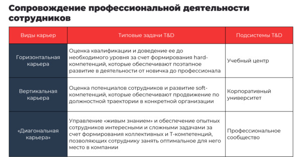 Вернемся к сопровождению профессиональной деятельности сотрудников, которым должна заниматься функция T&D. В таблице представлены типовые задачи этого сопровождения и инструменты (подсистемы T&D), необходимые для их реализации.