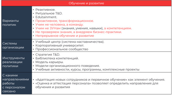 Обучение и развитие базируются либо на проактивном, либо на реактивном подходе. В первом случае обучение и развитие это производные от стратегии компании, то есть являются заказом управленческой команды (работа функции T&D декомпозиция стратегии организации «на язык» T&D). Во втором случае заказчиками обучения и развития являются топ-менеджеры и руководители среднего звена, которые «затыкают дыры», возникшие из-за изменения среды (как посредник выступают HRBP, без которых реактивный сервисный подход не работает). Например, обучение саморегуляции из-за возросшей неопределенности внешней среды.