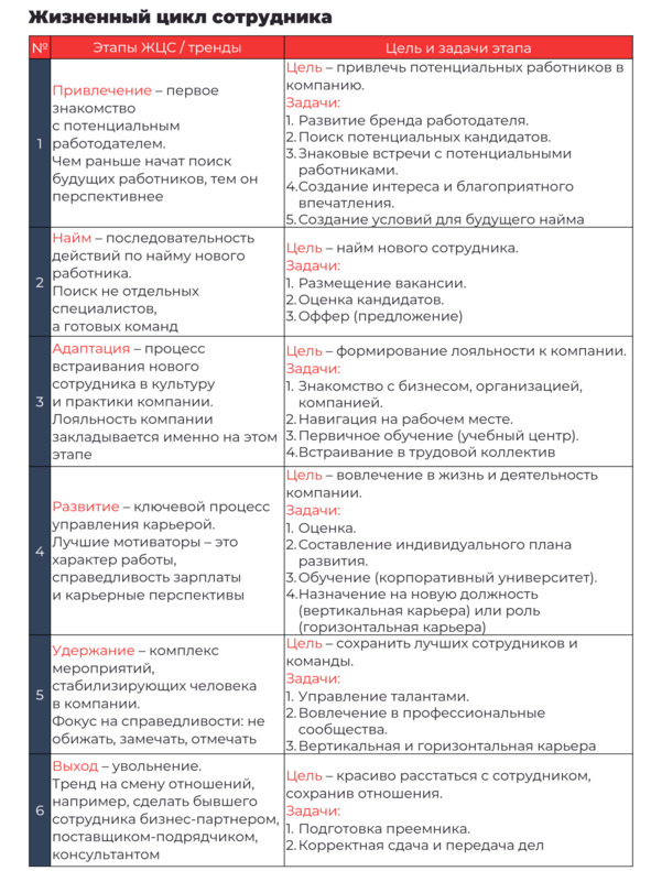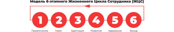 Жизненный цикл сотрудника (ЖЦС) это модель, позволяющая отслеживать весь путь, который сотрудник проходит в организации. ЖЦС начинается с момента, когда потенциальный сотрудник узнает о бренде, и продолжается до последнего дня его работы в компании. Помимо привлечения и увольнения, ЖЦС учитывает найм и адаптацию, удержание, развитие карьеры в компании.