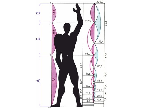 Беспрецедентная магическая популярность «золотой» пропорции основывается на том убеждении, что она является средством формообразования эстетически значимых, т.е. красивых, форм. Количество работ, основанных на таком убеждении, так велико, что не поддается какому-либо учету. Уже в 19 веке, по остроумному выражению одного из математиков, исследования в этом направлении «стали размножаться как фибоначчиевы кролики». В качестве одного из итогов такого «размножения» стала разработанная в 40-х годах прошлого века французским архитектором Ле Корбюзье система пропорций человеческого тела «Модулор» в котором основные размеры увязаны друг с другом в пропорции «золотого сечения» [10] (Рис.2).