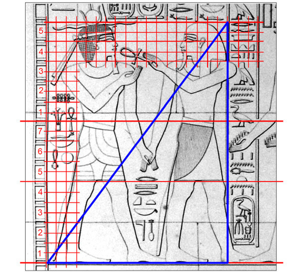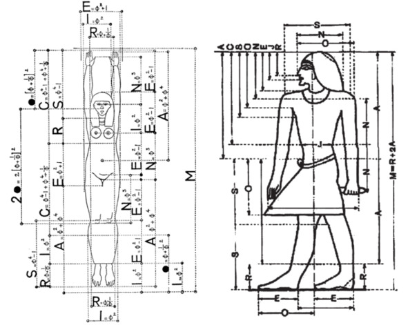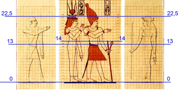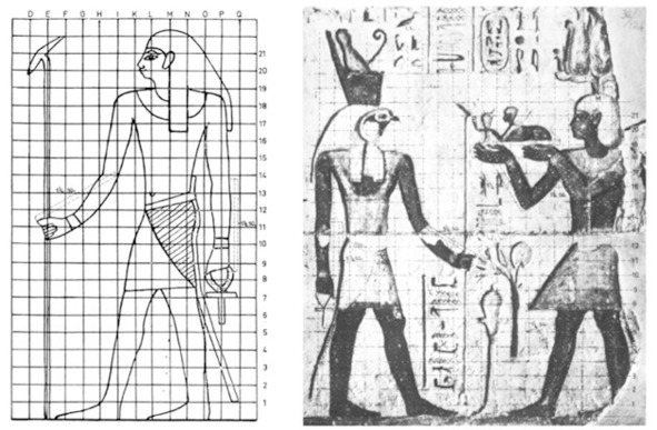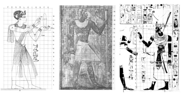 Поиски канона особо наглядно видны в исследованиях французского египтолога Эмиля Присса Д'Авена [18]. По одной и той же фигуре он пробует два разных канона с разными модульными сетками (Рис.9).