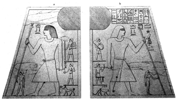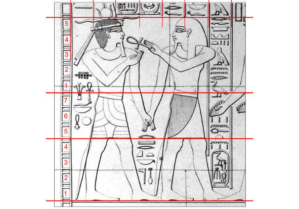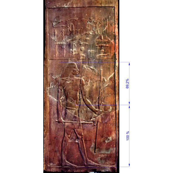 В 2001 году Ф.И.Куликовым была написана обобщающая академическая статья по поводу канонов пропорций в искусстве Древнего Египта. Автор постулирует, что «несмотря на признание большинством исследователей существования особых правил, служивших египетскому художнику в качестве руководства для построения пропорциональной фигуры, сам механизм этого построения и общую закономерность метрического соотношения частей изображений до сих пор найти не удается. Складывается во многом парадоксальная ситуация: все тематические справочники, специальная и научно-популярная литература говорят о существовании канона пропорций, дают ему историческую оценку, но сам канон обнаружить не удается, и каждый исследователь предлагает свое понимание его сущности» [13]. Поэтому, рассмотрим без обобщений, нужный нам материал, доступный для анализа. Так, в начале прошлого века в Саккаре археологи обнаружили склеп древнеегипетского зодчего Хеси-Ра. Там было найдено одиннадцать деревянных досок панелей с изображением древнеегипетского зодчего Хеси-Ра (Рис.5).