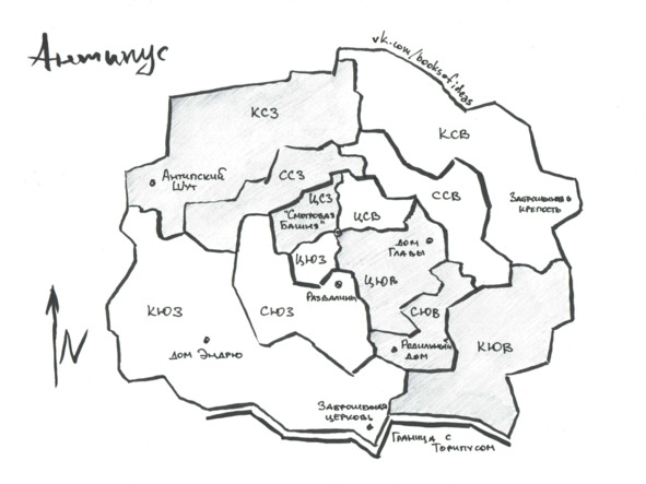 Антипус состоял из внутреннего диска центрального района и двух, среднего и крайнего, колец, огибающих его. По линиям направлений сторон света были неровно проведены границы, разделяя диск и кольца на четыре региона каждый: Центральные северо-западный, северо-восточный, юго-восточный и юго-западный, Средние и Крайние с такими же обозначениями. У каждого района был свой индекс. Для Центральных первой ставилась буква «ц», для Средних «с», для Крайних «к», а потом подписывалось окончание с обозначением сторон света: сз, св, юв, юз.