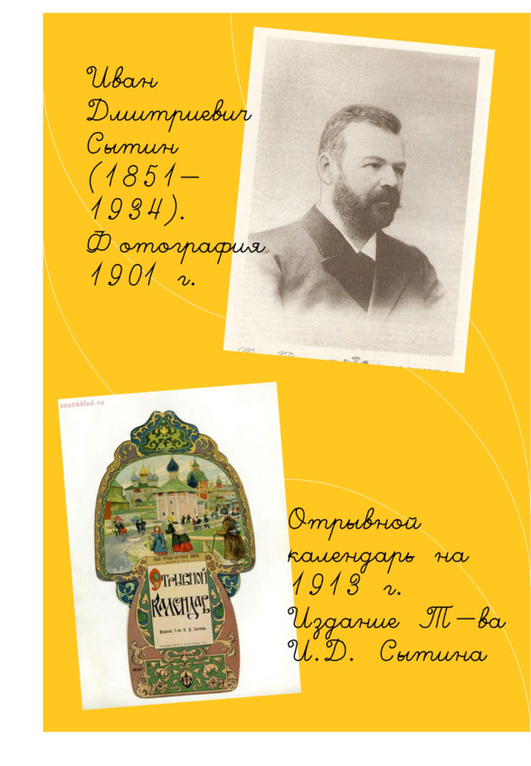 А в начале XX века почти в каждой избе около божницы можно было увидеть сытинские картины и численники (отрывные календари), а на полке или под божницей «Всеобщий Русский календарь» или «Общеполезный календарь» Товарищества Ивана Дмитриевича Сытина, которые любили рассматривать и детвора, и взрослые.