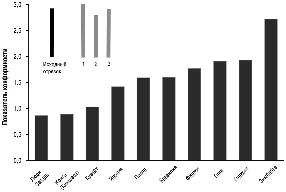 Рис. 1.3. Степень конформности, выявленная в ходе эксперимента Соломона Аша в 10 различных популяциях. Показатели для обществ Запада, Японии и Бразилии являются усредненными данными нескольких исследований{57}