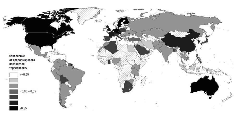 Рис. 1.4. Всемирная карта терпеливости, охватывающая 76 стран. Более темные оттенки указывают на большее терпение. Для заштрихованных областей данные отсутствуют{59}
