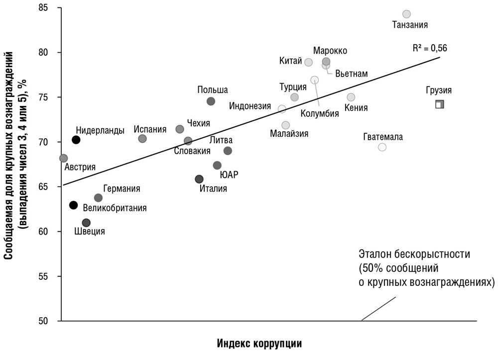 Рис. 1.5. Корреляция между долей участников, сообщивших о выпадении на кубике 3, 4 или 5, для каждой страны и индексом коррупции. Чем темнее точка, тем выше для этой страны значение показателя психологического индивидуализма (рис. 1.2). Заштрихованная рамка в случае Грузии указывает на отсутствие данных об уровне индивидуализма{67}