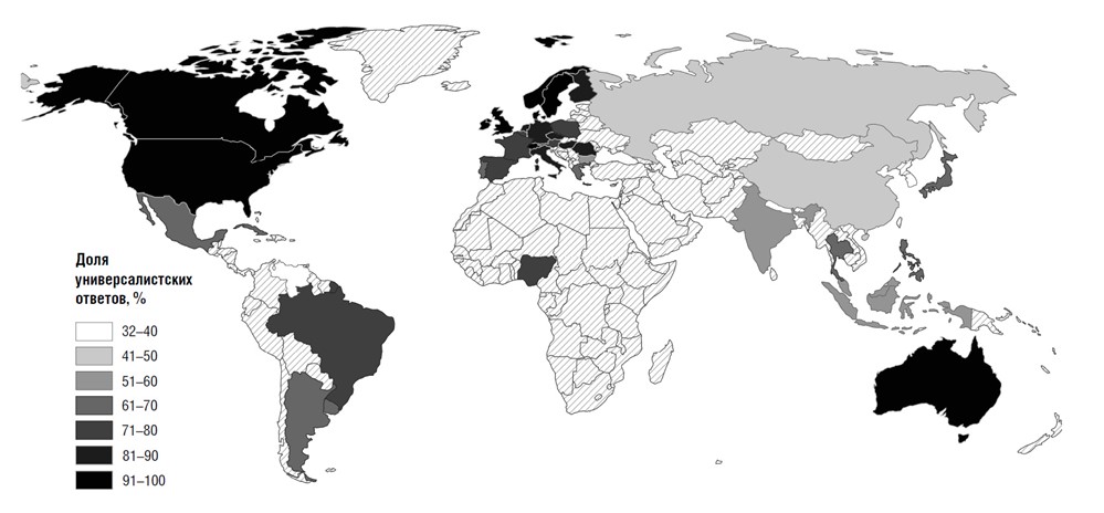 Рис. 1.6. Доля универсалистских (непредвзятых) ответов на дилемму пассажира среди менеджеров в 43 странах мира. Более темная заливка отражает более высокую долю людей, которые дали универсалистский ответ и, таким образом, не пожелали помочь другу. Для заштрихованных областей данные отсутствуют{69}