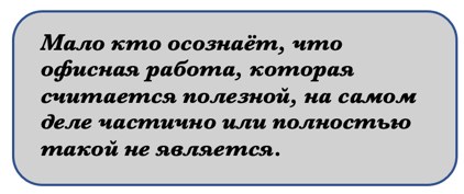 Однако мало кто из опрошенных осознает, что работа, которая считается полезной, на самом деле частично или в значительной степени такой не является. Если исходить из того, что полезность определяется величиной реального вклада сотрудника в повышение ценности производимых изделий и предоставляемых услуг клиентам, то реальный вклад оказывается непропорционально мал по сравнению с затраченными усилиями. В основном энергия исполнителей затрачивается на операции, которые не направлены непосредственно на приращение этих ценностей и являются по своей сути имитацией полезной деятельности.