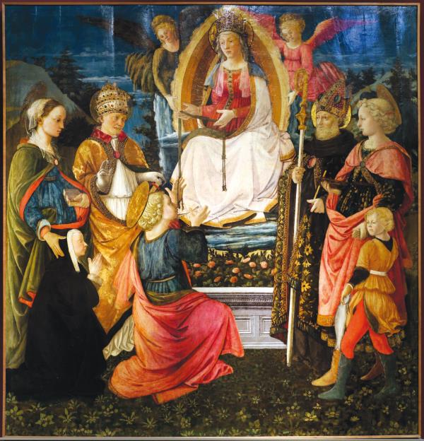 Фра Филиппо Липпи и фра Диаманте. «Мадонна делла Чинтола» («Мадонна в Успении, дающая свой Пояс св. Фоме, со свв. Григорием, Маргаритой, Августином, архангелом Рафаилом и Товией»). 14561460 гг. Городской музей (Прато)