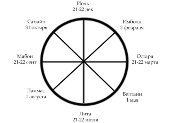 Когда мы слышим «Колесо Года», то представляем себе, чаще всего, такие понятия, как «ведьмовство», «колдовство», «викка», «кельты». Они переплелись друг с другом, т.к. все эти понятия крепко связаны с нашей Вселенной, с естественными ритмами природы, со старыми традициями народов Европы, которые ничто не может изменить и изгнать из нашего подсознания, из нашей сущности, потому что они естественны, т.к. все мы живем в этом мире. Колесо Года подобно солнцу, которое катится по небосводу не только каждый день, но и в течение года, задавая определённые ритмы нашей жизни, подобно колесу огненной колесницы. И как у каждого колеса есть спицы, так и в Колесе Года есть свои опорные точки, и их ровно восемь, т.е. два креста по четыре спицы.