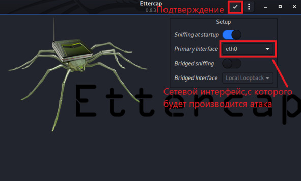 Для реализации данной атаки воспользуемся сетевой топологией из предыдущего задания и утилитой Ettercap, которая доступна в репозиториях Kali Linux.