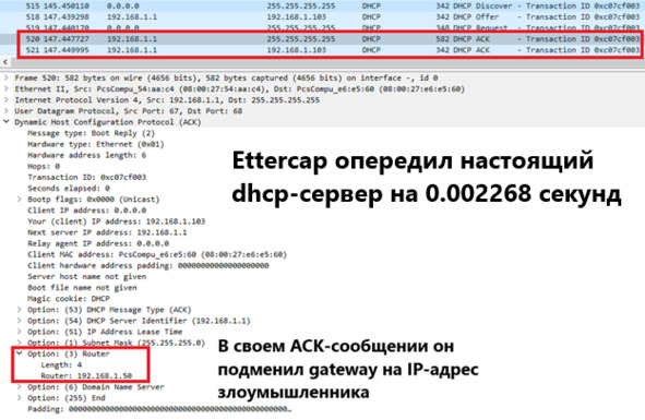 Если по какой-то причине Ettercap систематически проигрывает гонку против DHCP-сервера, перенастройте DHCP-spoofing на отправку OFFER-сообщений.