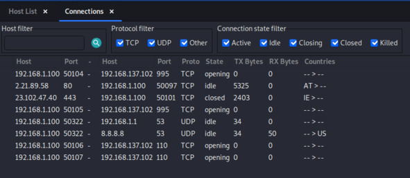Теперь злоумышленник прослушивает весь трафик между PC-1 и роутером. Для того, чтобы отобразить текущее соединение в Ettercap откройте «Ettercap Menu View Connections» (рисунок 3.15).