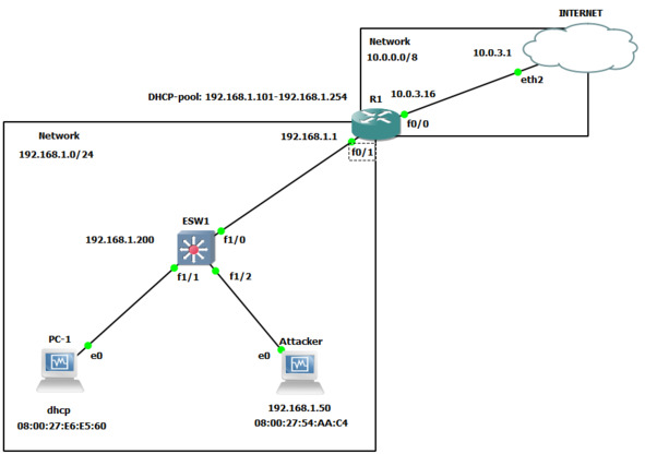Целью данной атаки будет попытка атакующего вклиниться в канал передачи данных от PC-1 до R1. Таким образом атакующий будет иметь доступ ко всему трафику, который получает и отправляет жертва.